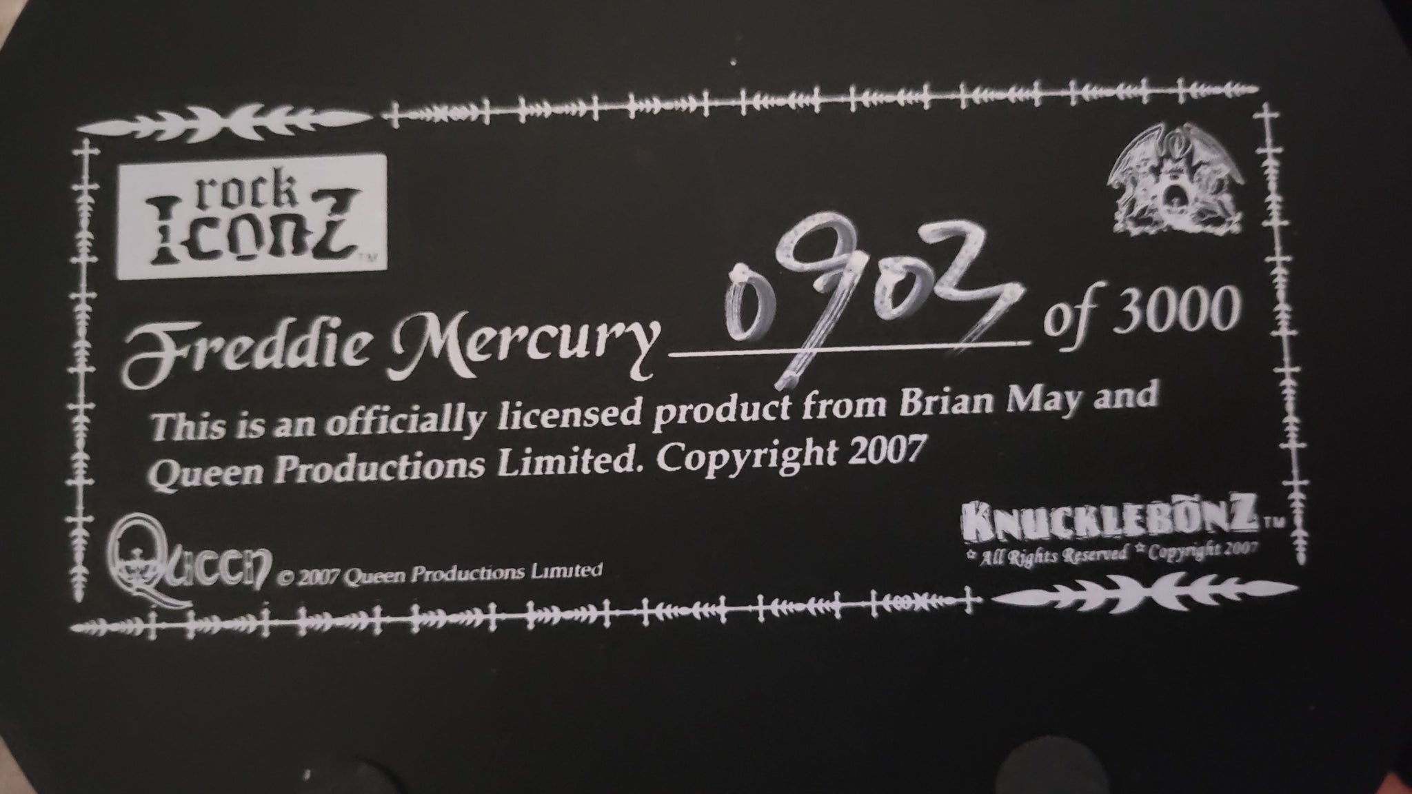 Knucklebonz Rock Iconz 2007 Freddie Mercury from Queen. Very Rare hard to find! New Never displayed Inspected and Photographed certificate #903 of 3000.Box shows some normal ware due to age and shipping from manufacturer.This is very rare and the hottest Knucklebonz statue on the market. Only 3000 pieces created and sold worldwide and SOLD OUT. All Rock Iconz statues are officially licensed, limited edition collectibles. Each piece is hand-crafted. This is a fine-arts process where each statue is hand-cast, painted and numbered. These statues are created in 1/9 scale, making the average height of each approximately 8.5” tall and each statue comes with a certificate of authenticity on the base of the statue.