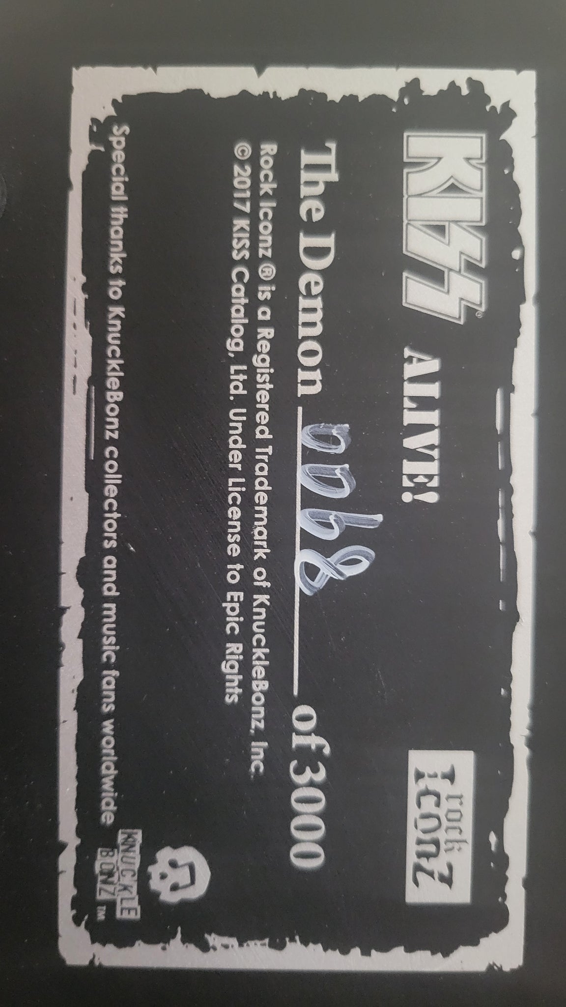 Knucklebonz Rock Iconz 2017 Gene Simmons KISS Alive!. New Never displayed Inspected and Photographed certificate  #68 of 3000  Super rare as only 3000 pieces created and sold worldwide SOLD OUT. All Rock Iconz statues are officially licensed, limited edition collectibles. Each piece is hand-crafted. This is a fine-arts process where each statue is hand-cast, painted and numbered. These statues are created in 1/9 scale, making the average height of each approximately 8.5” tall and each statue comes with a certificate of authenticity on the base of the statue.