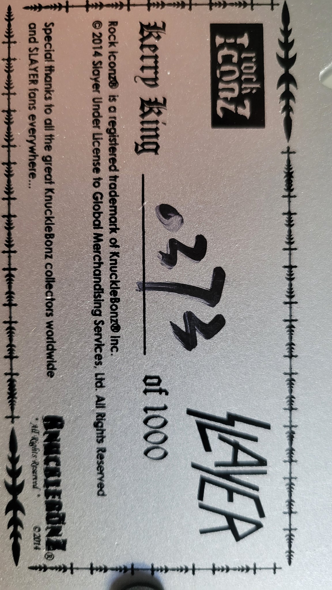Knucklebonz Rock Iconz 2014 Kerry King of Slayer. Very Rare / hard to find. Photographed certificate #373 of 1000. Only 1000 created and SOLD OUT worldwide many years ago. All Rock Iconz statues are officially licensed, limited edition collectibles. Each piece is hand-crafted. This is a fine-arts process where each statue is hand-cast, painted and numbered. These statues are created in 1/9 scale, making the average height of each approximately 8.5” tall and each statue comes with a certificate of authenticity on the base of the statue.