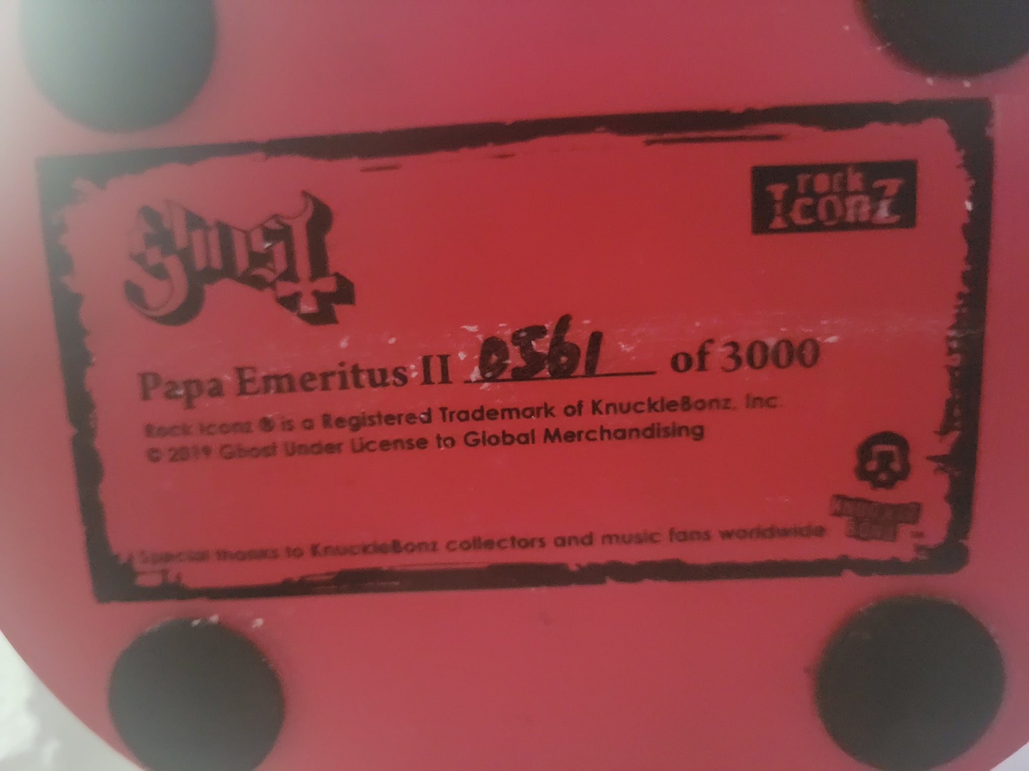 Ghost Papa Emeritus 2 Knucklebonz Rock Iconz 2019 Ghost New Never displayed Inspected and Photographed certificate  # 561 of 3000 .... Only 3000 pieces created and sold worldwide .SOLD OUT..All Rock Iconz statues are officially licensed, limited edition collectibles. Each piece is hand-crafted. This is a fine-arts process where each statue is hand-cast, painted and numbered. These statues are created in 1/9 scale, making the average height of each approximately 8.5” tall and each statue comes with a certificate of authenticity on the base of the statue.